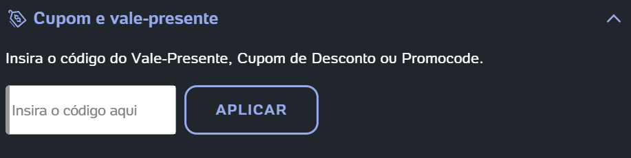 4. Finalize a sua compra: Na etapa FORMA DE PAGAMENTO insira novamente o MESMO CÓDIGO no campo Cupom e vale-presente, como na imagem abaixo e clique em APLICAR: